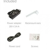 CRS112-8P-4S-IN, IEC cord, 28V 3.4A power adapter, K48 screw kit, Rack ears.