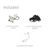The box includes two LHGG-60ad devices that are already paired together, power supplies, PoE injectors and mounting kits for both devices.